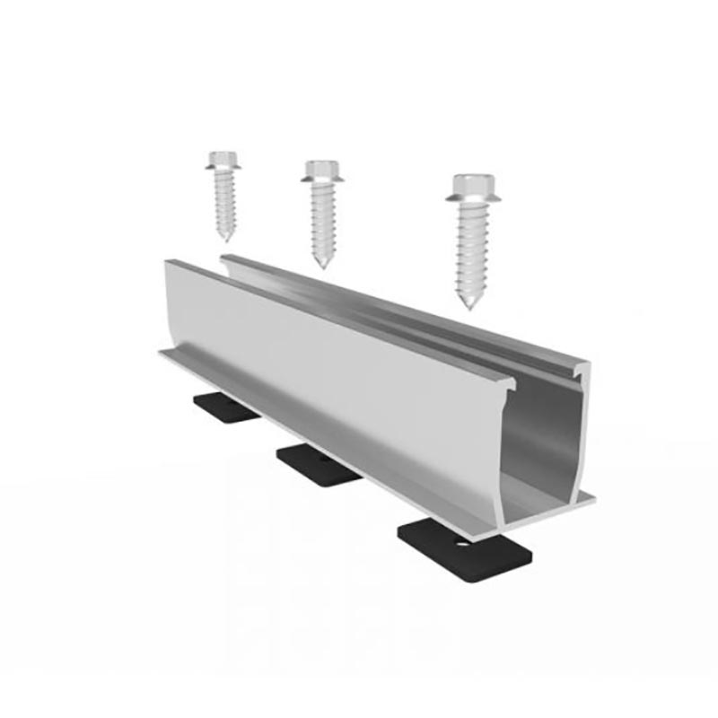 Para telhados metálicos finos (0,8-1,2 mm de espessura), não é necessária pré-perfuração. É fixado nos topos do telhado através de parafusos ou fivelas auto-roscantes, sem danificar o telhado. Uma almofada de borracha EPDM na parte inferior do trilho se ajusta à superfície ondulada, garantindo estabilidade e impermeabilização.